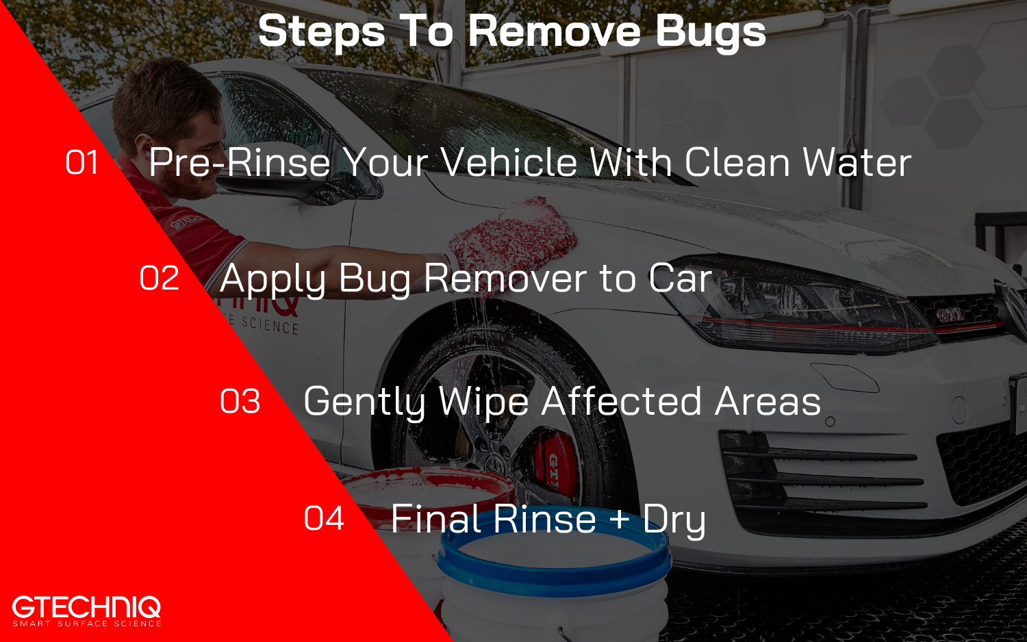 Start by rinsing your vehicle. This helps loosen dead bugs and road grime. If water access is limited, a waterless wash is a great option.
