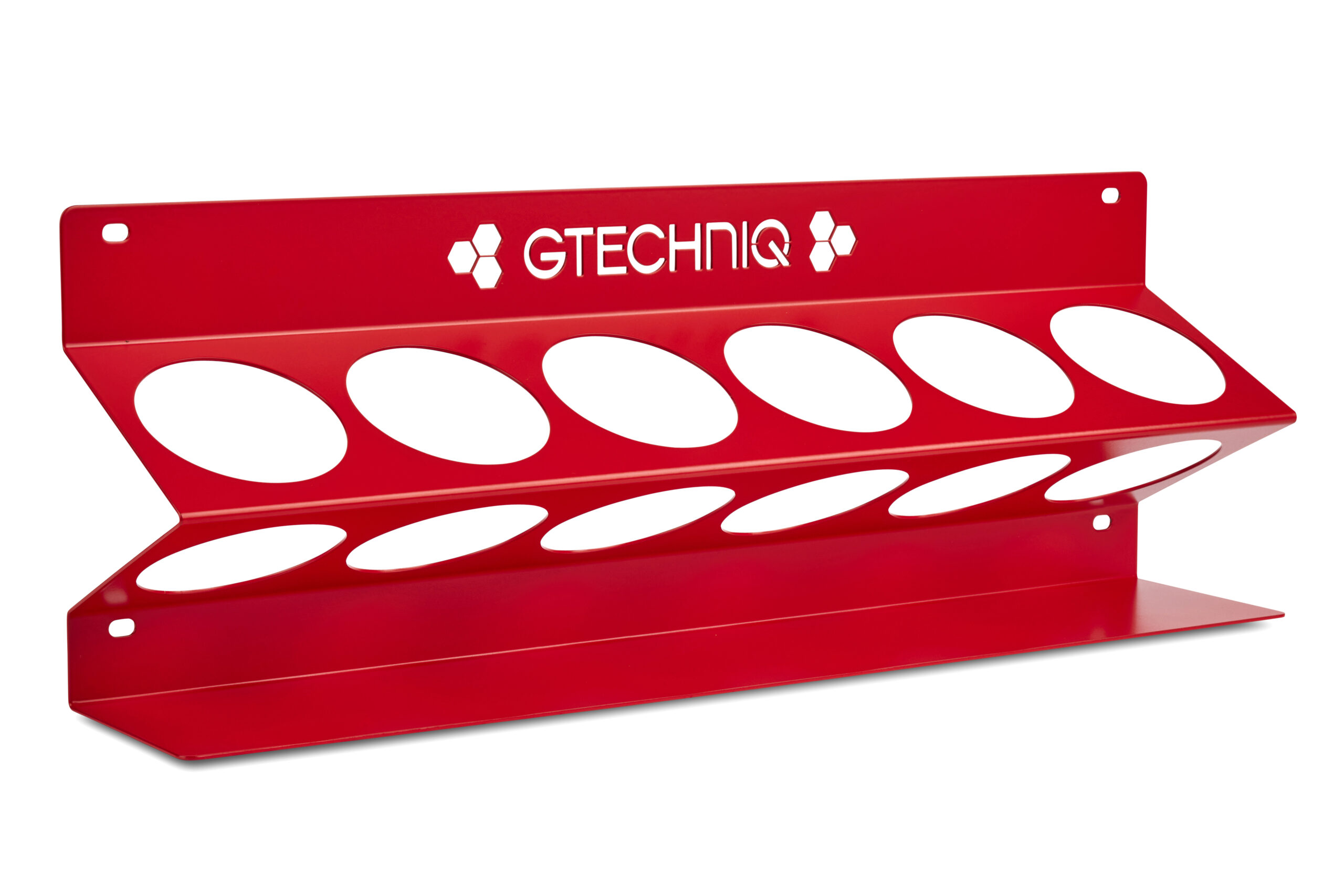 The wall-mounted coating caddy has been designed to hold 6, 500ml Gtechniq bottles. The unit is constructed of high-grade steel and has a matt red powder-coated finish. Each holder comes with a laser-cut Gtechniq logo and hexagon design. The coating holder measures 495mm wide x 95mm deep x 180mm high. Wall mounting screws are not included.