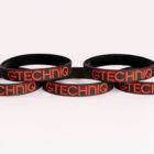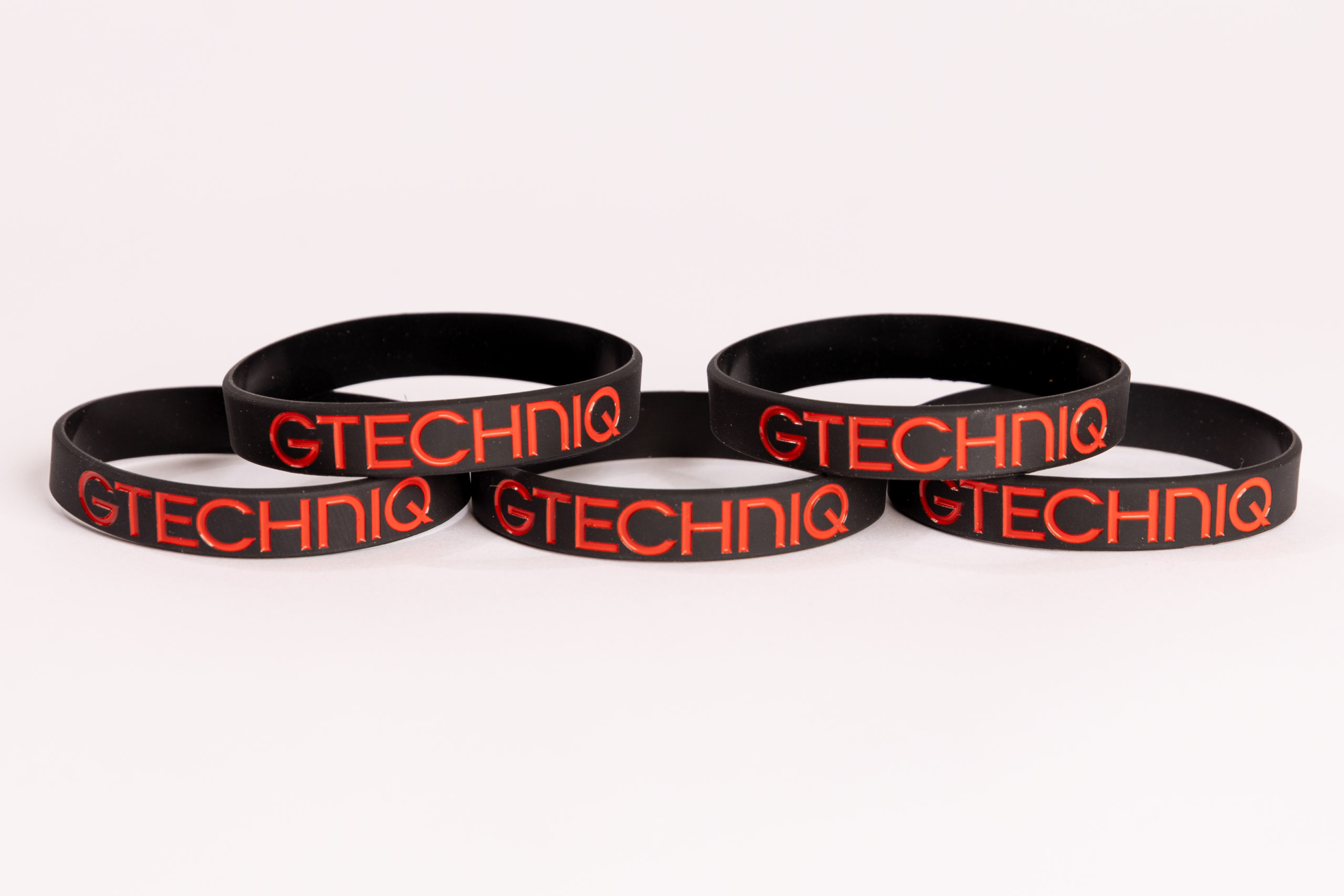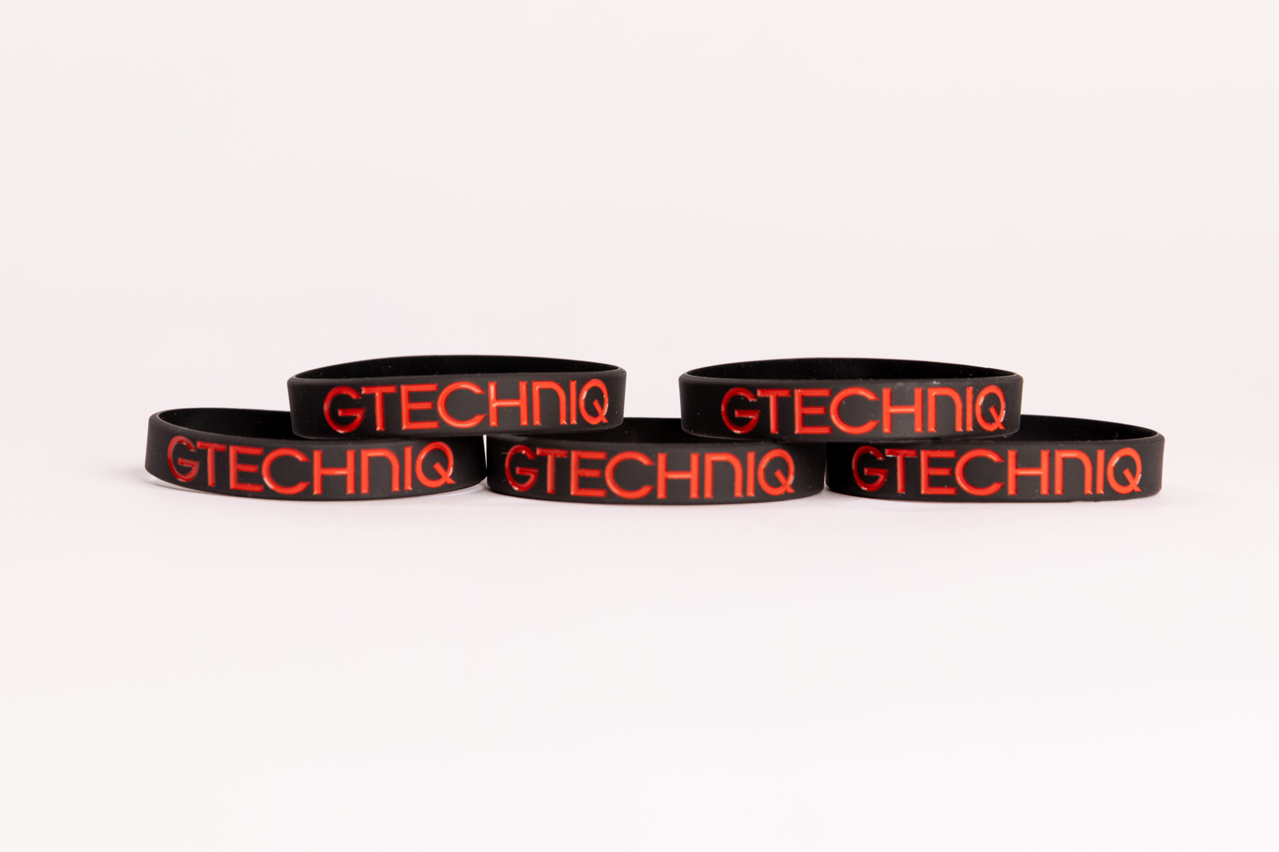 5 Pack of black silicone wrist bands with Gtechniq logo debossed in red