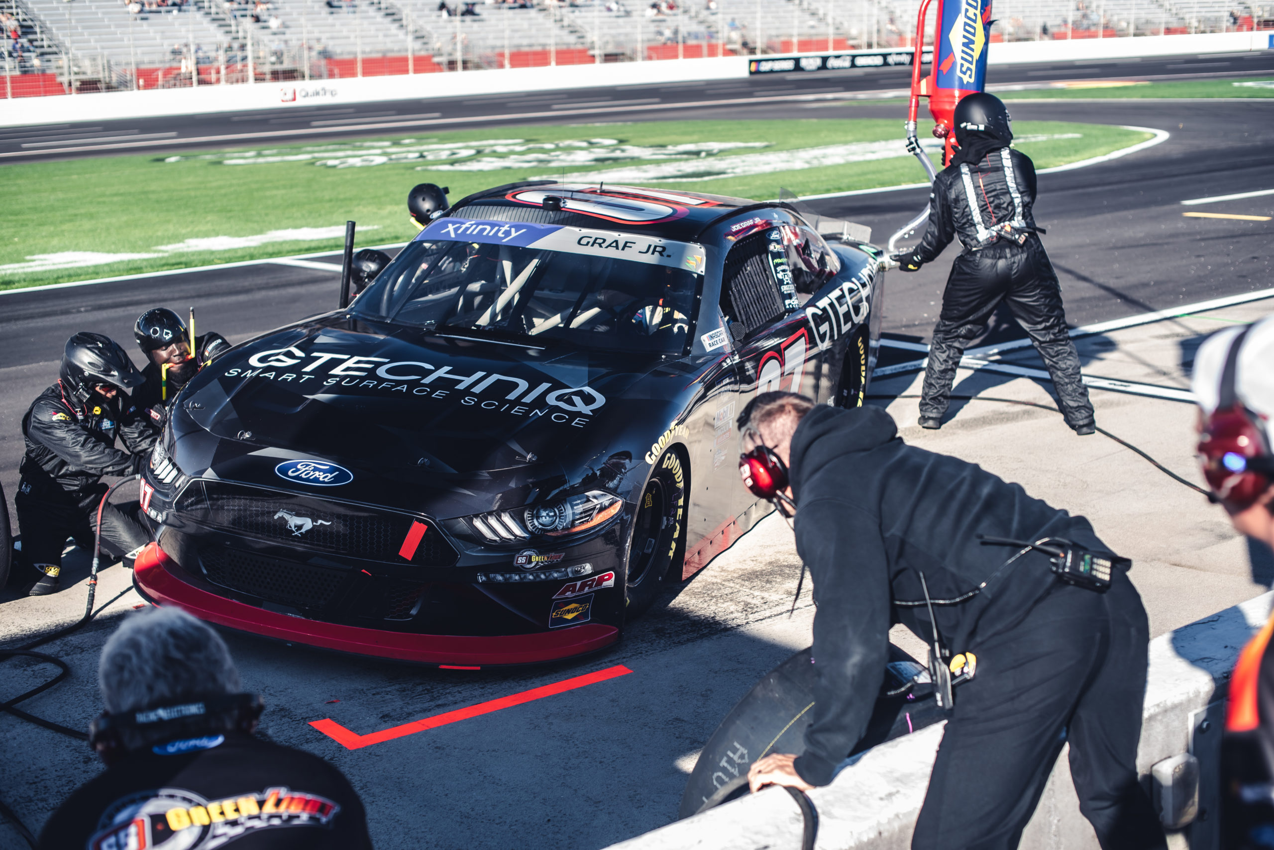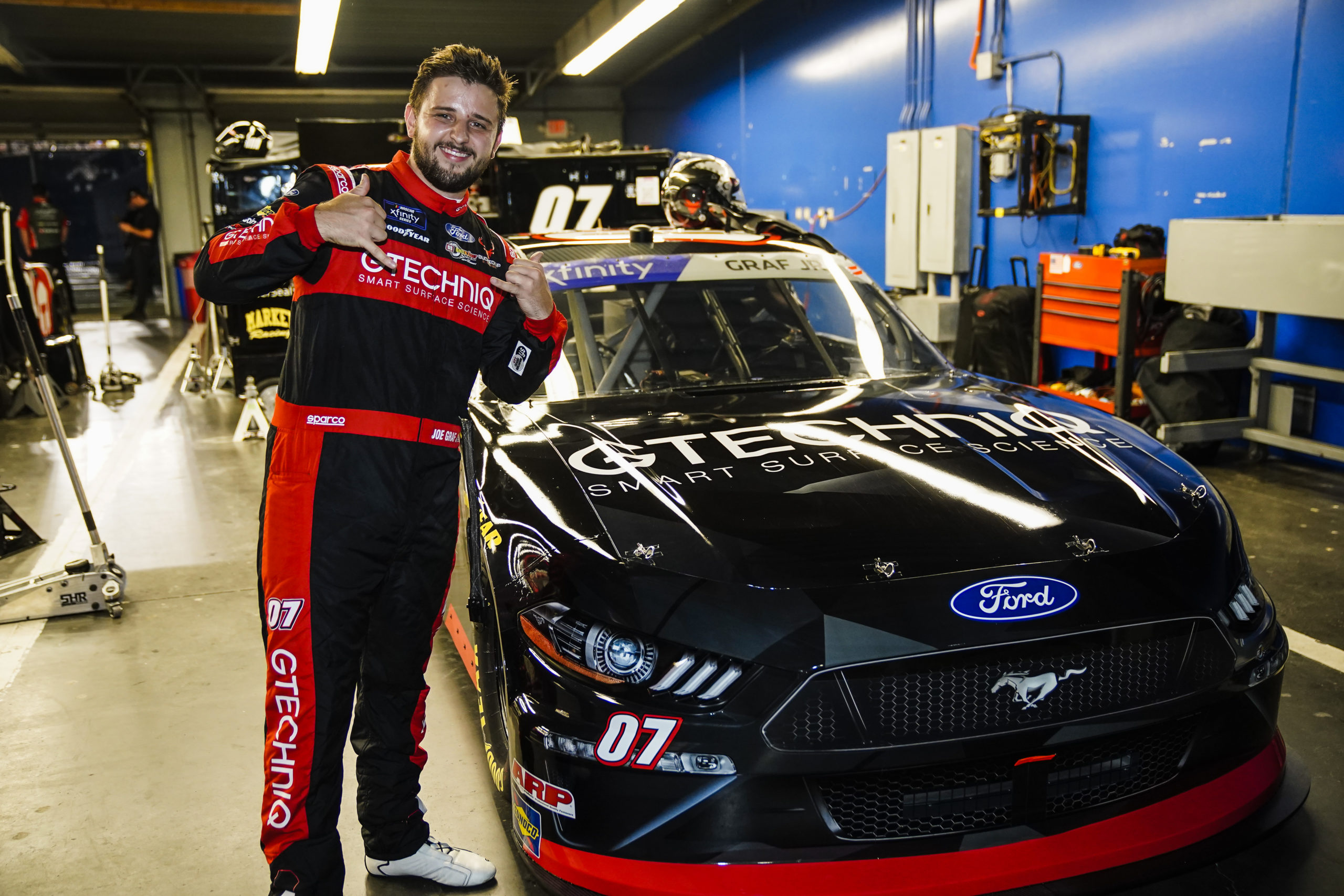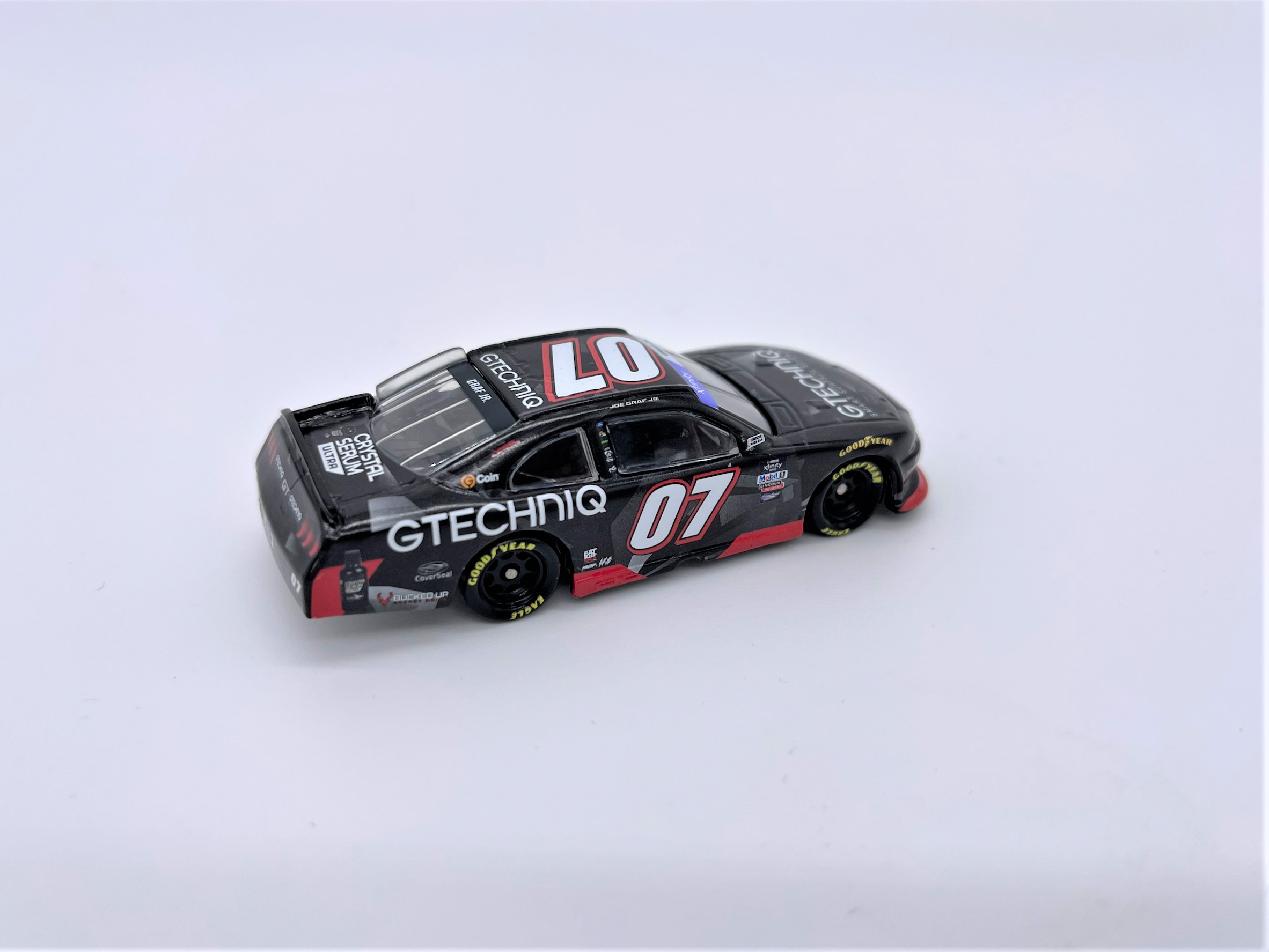 Die-Cast replica of the GTECHNIQ #07 Ford Mustang driven by Joe Graf Jr. during the 2022 NASCAR Xfinity series. The car made its debut at Atlanta Motor Speedway on March 15th for the Nalley Cars 250 and followed that up with a second appearance at Daytona International Speedway on August 26th for the Wawa 250.